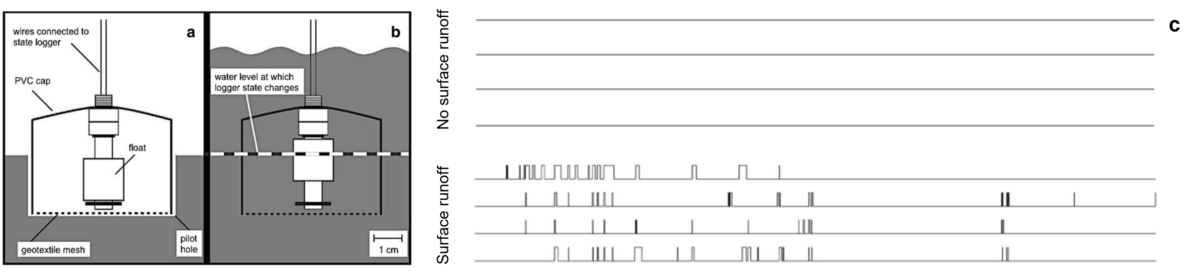 Figure 1 Schematic of buoyant polypropylene float switch. The float switch state is open when water is absent (a) and closed when water is present (b). An associated state data logger records the timing of state changes. Example of data from float switch when no surface runoff is present and when surface runoff is present (c). All adapted from McDonough et al. 2015